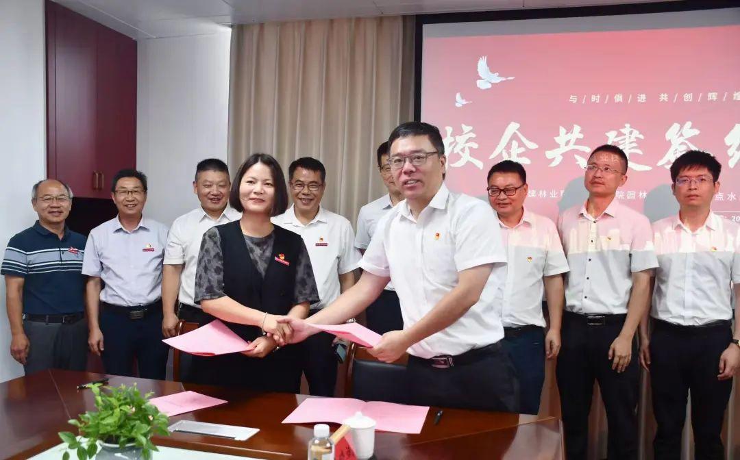 林職院園林系黨總支書記黃淑燕、系主任黃華明和山點(diǎn)水公司黨支部書記王志龍、總經(jīng)理季恭國,分別代表福建林業(yè)職業(yè)技術(shù)學(xué)院園林系和南平市山點(diǎn)水園林有限公司現(xiàn)場正式簽署《黨建共建協(xié)議》和《校外實(shí)訓(xùn)基地共建協(xié)議》。