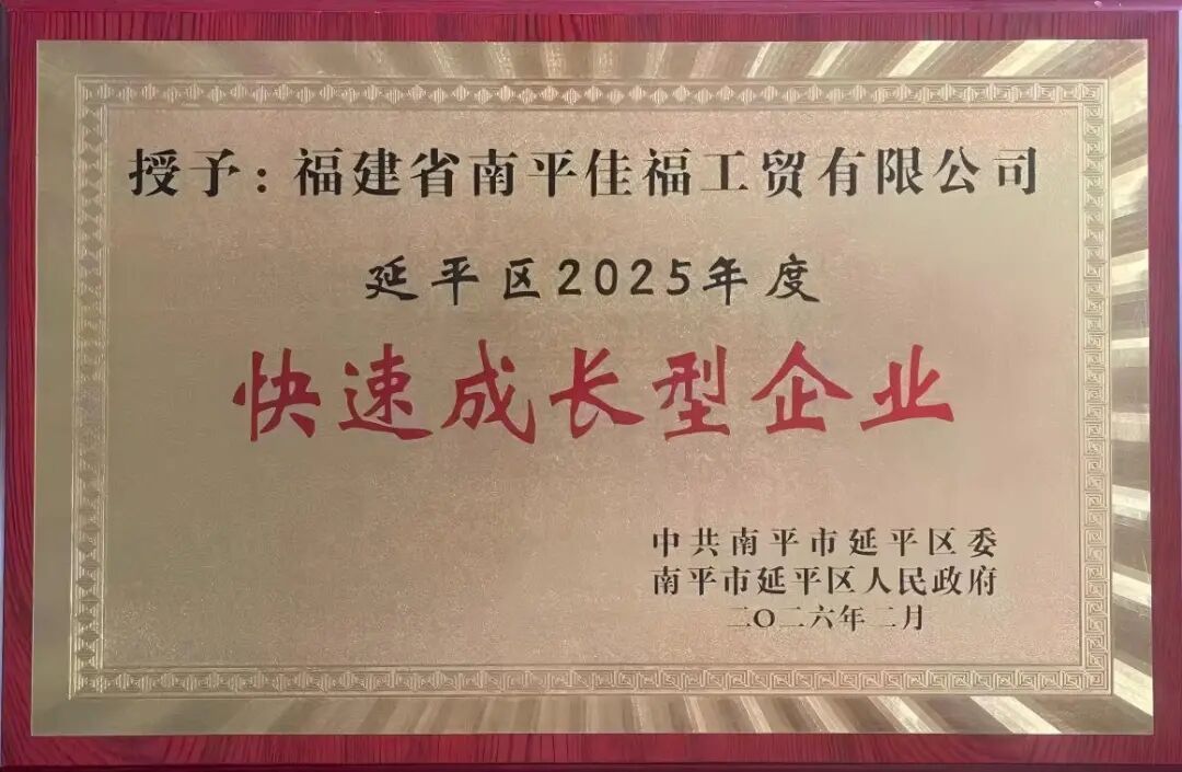 2026年2月26日,佳福工貿公司被中共南平市延平區委、南平市延平區人民政府授予“延平區2025年度快速成長型企業”榮譽稱號。